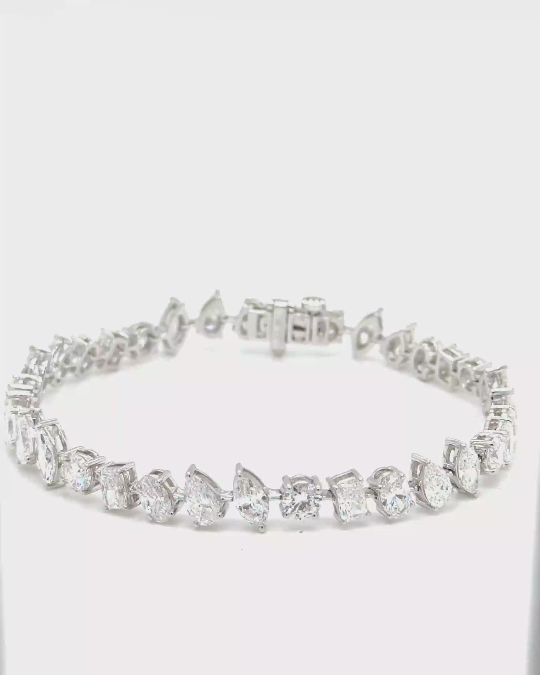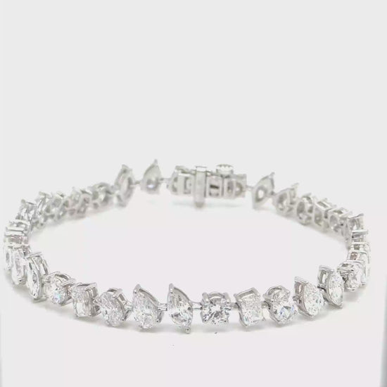 A true statement of brilliance. This exquisite 14K white gold tennis bracelet features 9.39 carats of mixed-shape diamonds, carefully arranged in an eye-catching pattern of radiant, oval, pear, marquise, and round cuts. Each stone is hand-selected and expertly set to highlight its unique sparkle, creating a bold yet elegant look that stands out from every angle.