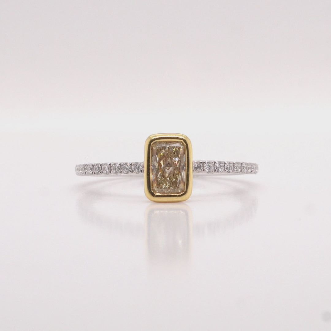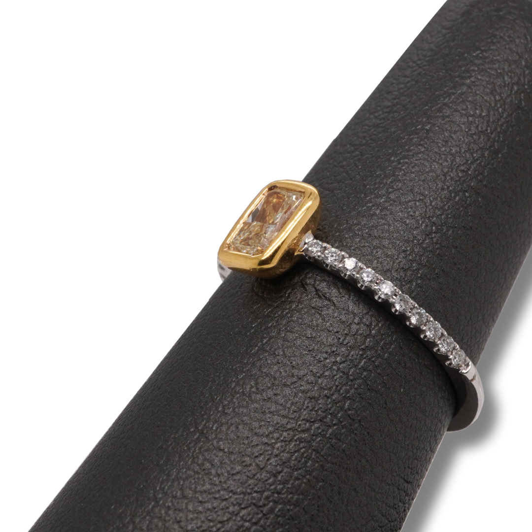 Or blanc 18 carats avec un diamant jaune de 0,60 ct et 0,16 ct de petits diamants.
