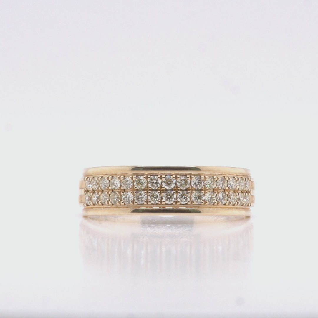 Celebrate timeless love with this elegant 10K yellow gold anniversary ring, featuring 0.6 carat natural diamonds as the focal point. The ring showcases three rows of dazzling, round-cut diamonds, perfectly set in a pavé design to enhance their brilliance. The wide gold band offers a luxurious feel, while the centered natural diamonds provide an exquisite sparkle, making this piece ideal for special occasions like anniversaries, milestones, or as a statement jewelry piece. Crafted with care and precision, this diamond-studded ring is a stunning symbol of enduring love and elegance.