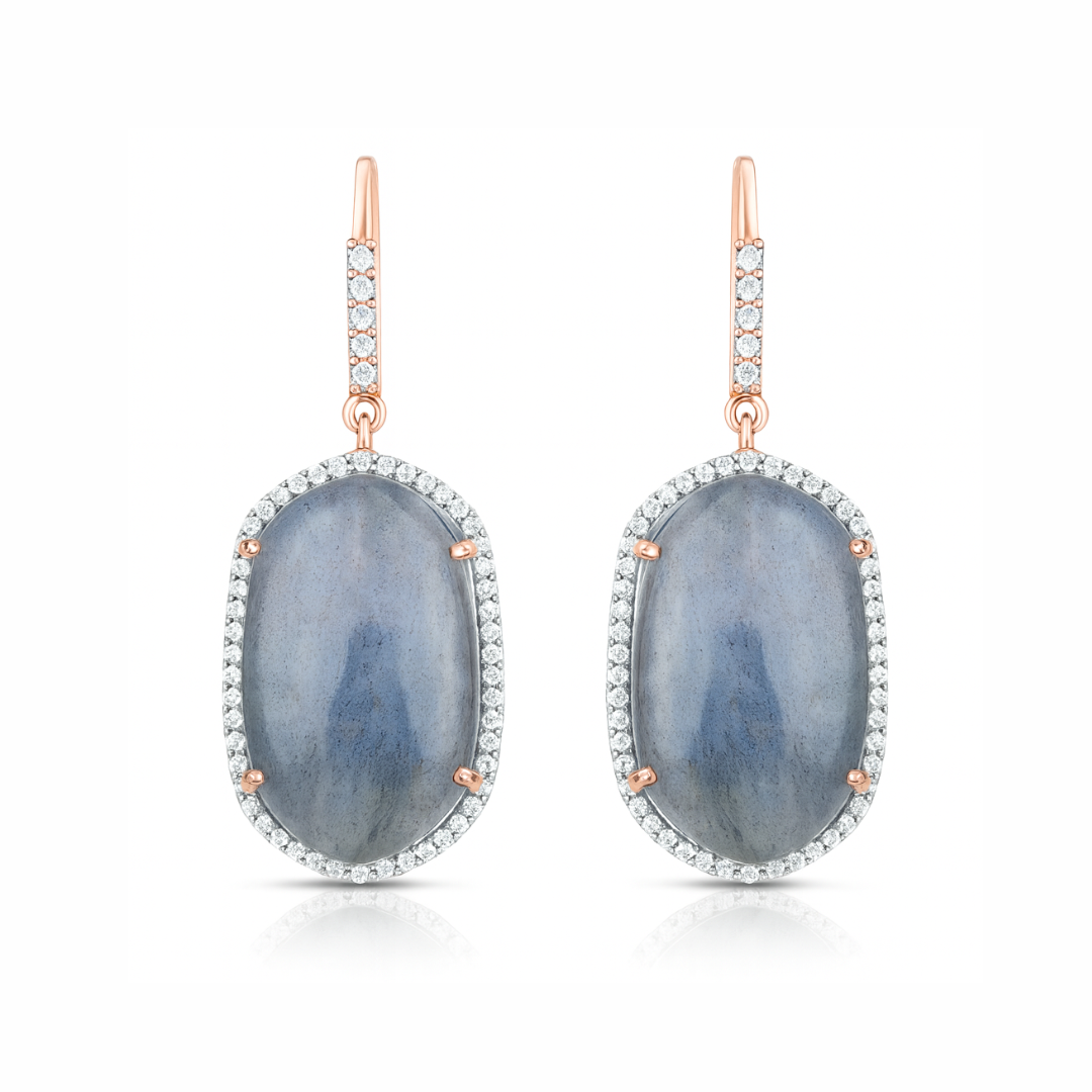 Adorn yourself in enchanting elegance with our 14K Rose Gold Plated Earrings, featuring a dazzling 28.08 Carat Genuine Labradorite and White Topaz accents in high-quality .925 Sterling Silver. The mysterious play of colors within the labradorite, paired with the sparkling white topaz, creates a harmonious and sophisticated design. Meticulously crafted, these earrings are a celebration of refined luxury and timeless beauty. Make a statement with the captivating allure of this exquisite pair, perfect for adding a touch of glamour to any ensemble.