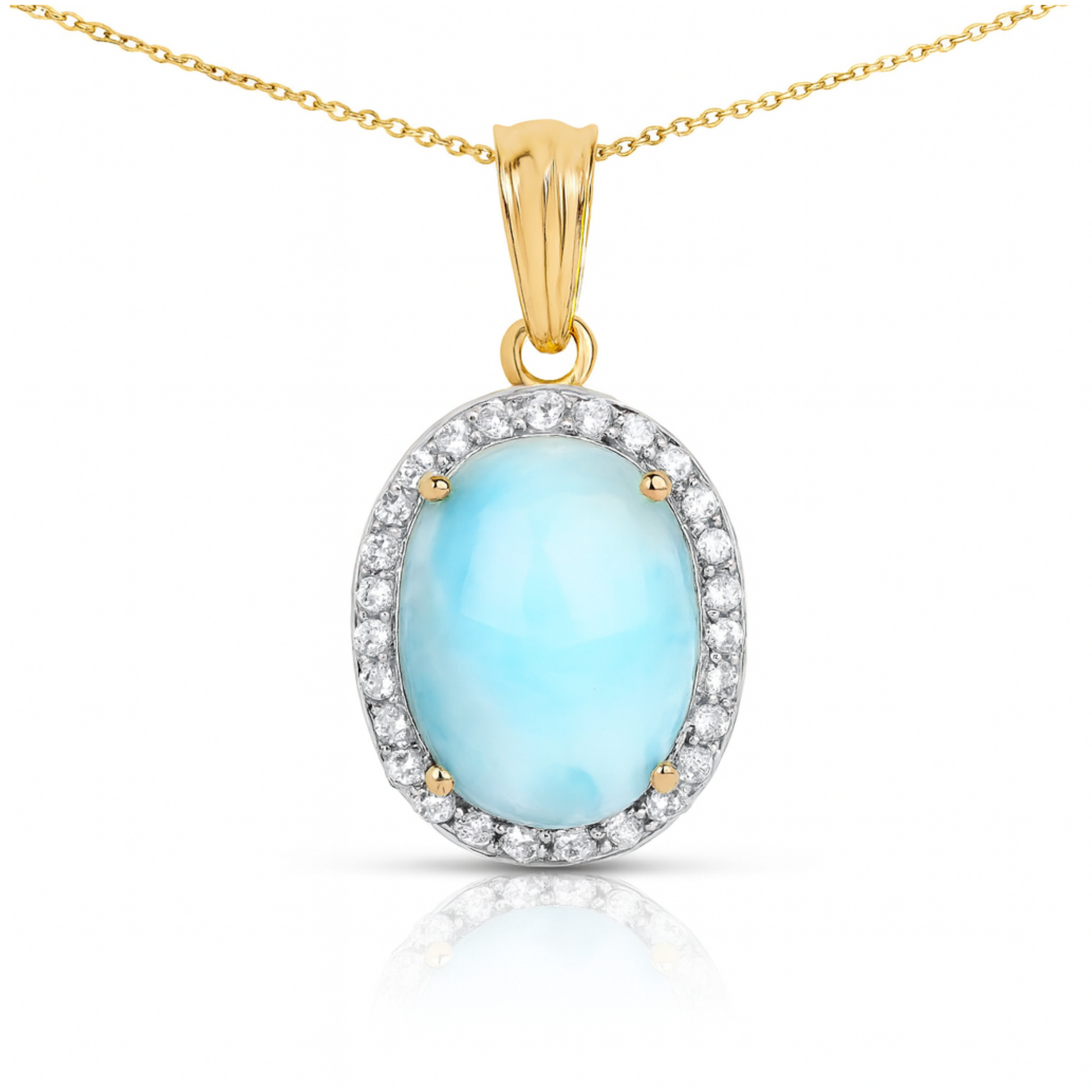 Elevate your style with our 14K Yellow Gold Plated Larimar and White Topaz Pendant. A stunning fusion of elegance and luxury, this pendant features a 13.55 Carat Genuine Larimar gemstone accented with sparkling White Topaz, all set in .925 Sterling Silver. The radiant blue hues of Larimar and the warmth of the gold-plated finish create a captivating piece that effortlessly transitions from day to night, making it a perfect addition to your jewelry collection or a thoughtful gift.