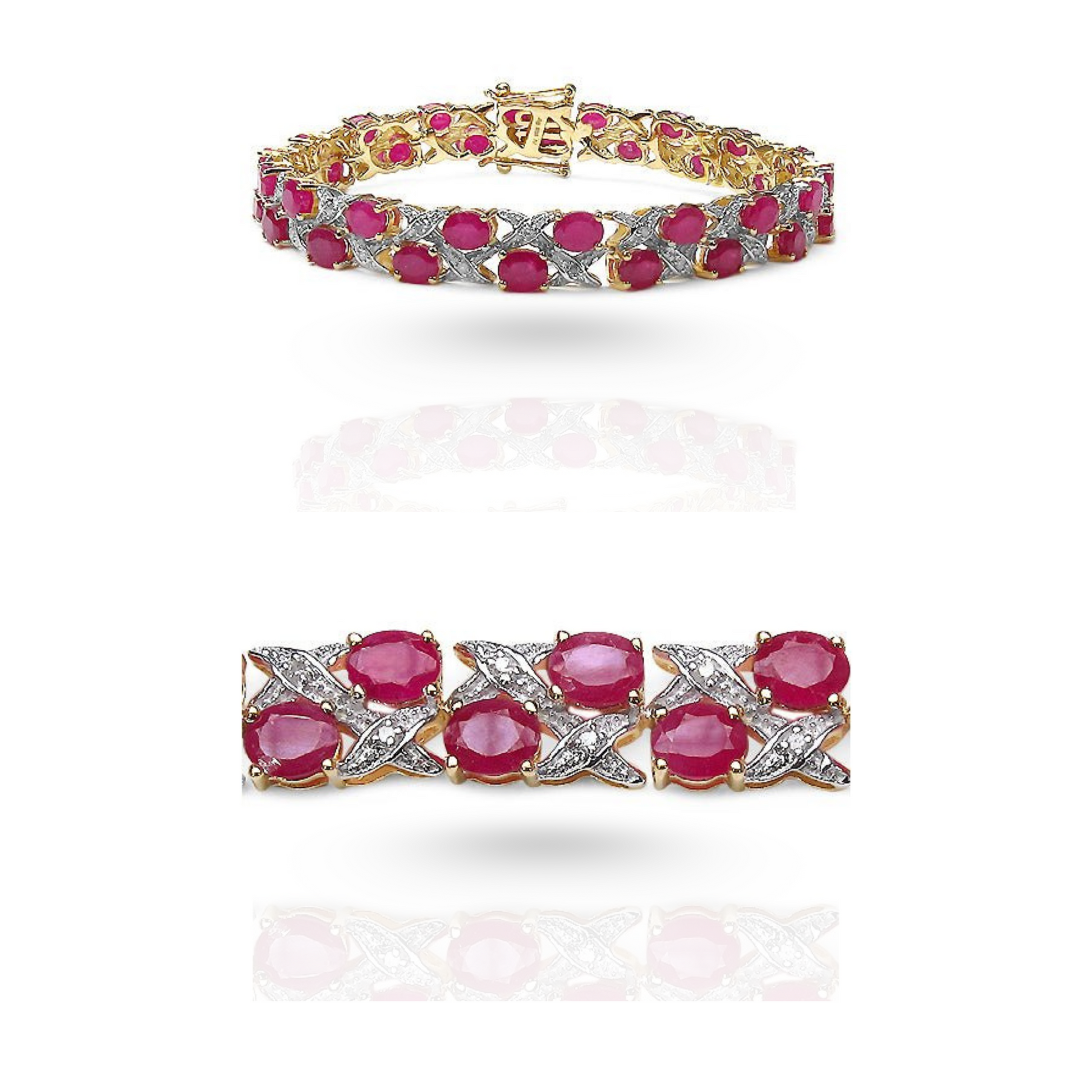 Adorn your wrist with opulence in our 14K Yellow Gold Plated Bracelet, featuring a breathtaking 18.32 Carat Genuine Ruby set in high-quality .925 Sterling Silver. The deep red allure of the rubies, paired with the radiant gold plating, creates a striking and luxurious design. Meticulously crafted, this bracelet is a statement of timeless sophistication and bold glamour. Elevate your style with the captivating beauty of this exquisite piece, the perfect accessory to command attention on any occasion.