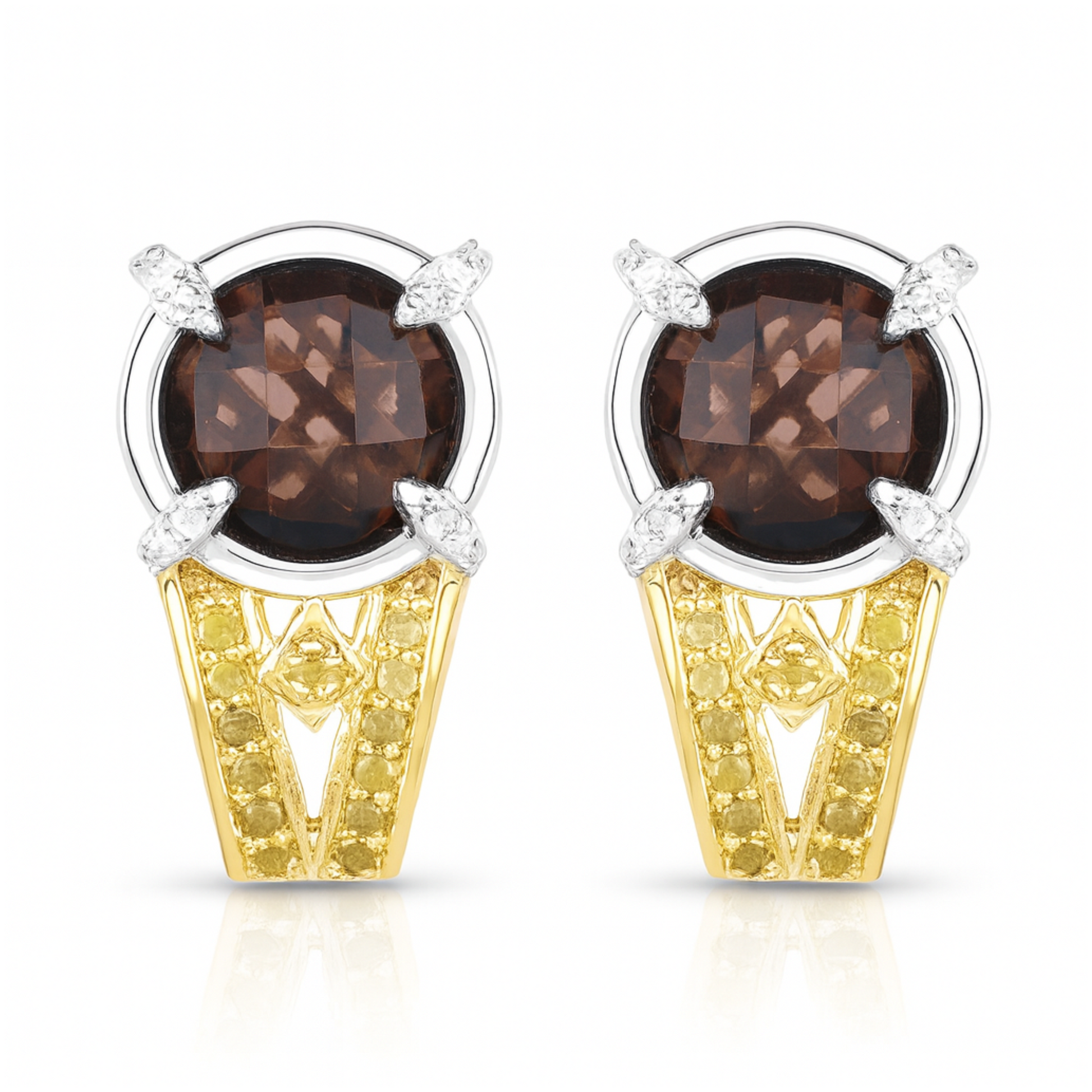 3.75 Carat Genuine Smoky Quartz, Yellow Diamond and White Diamond .925 Sterling Silver Earrings
